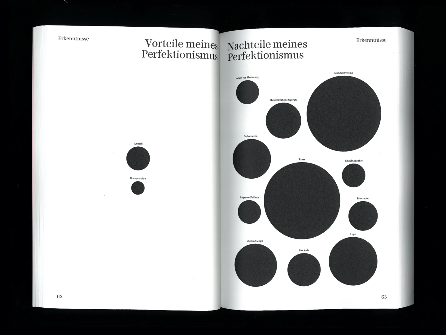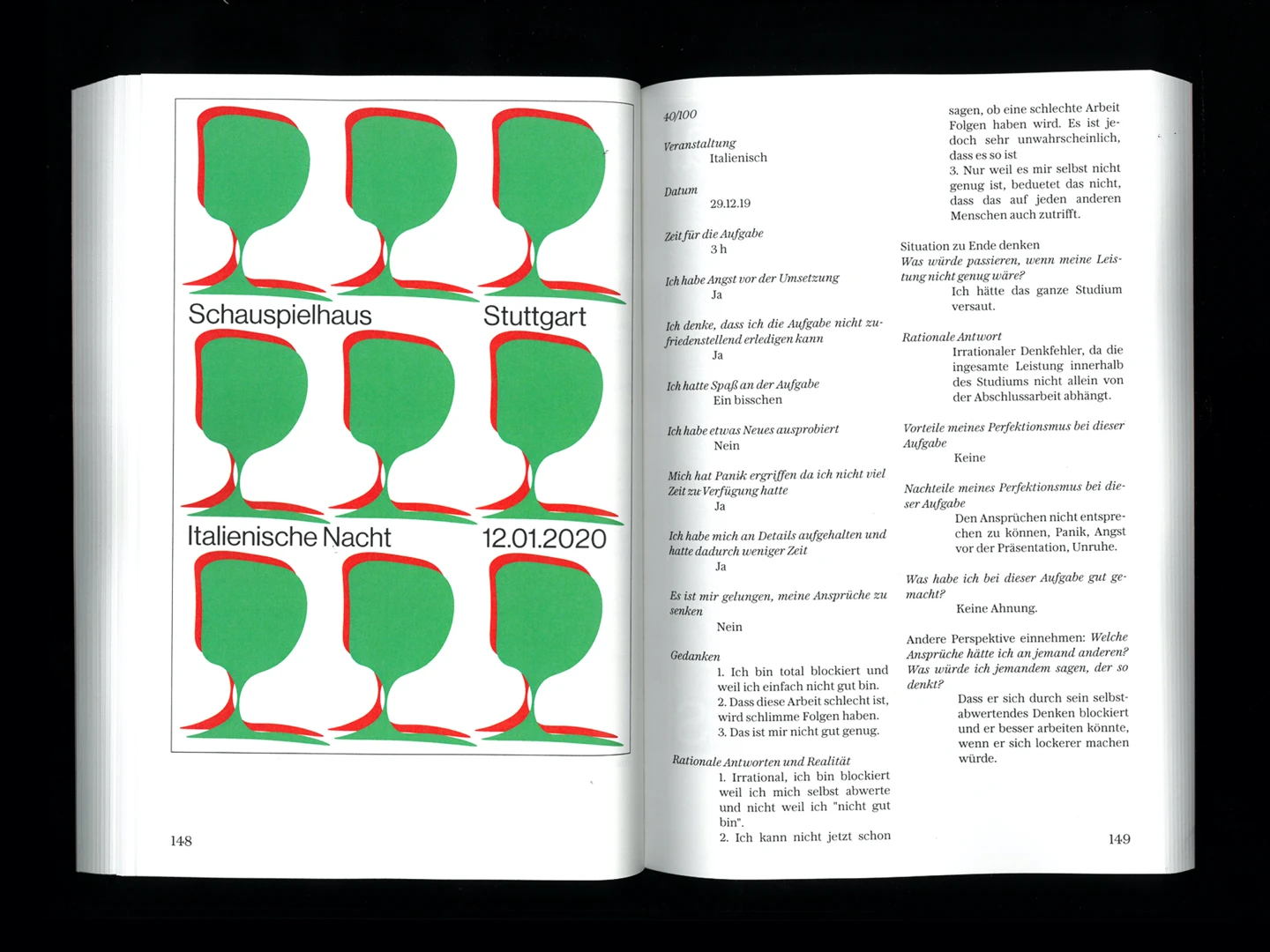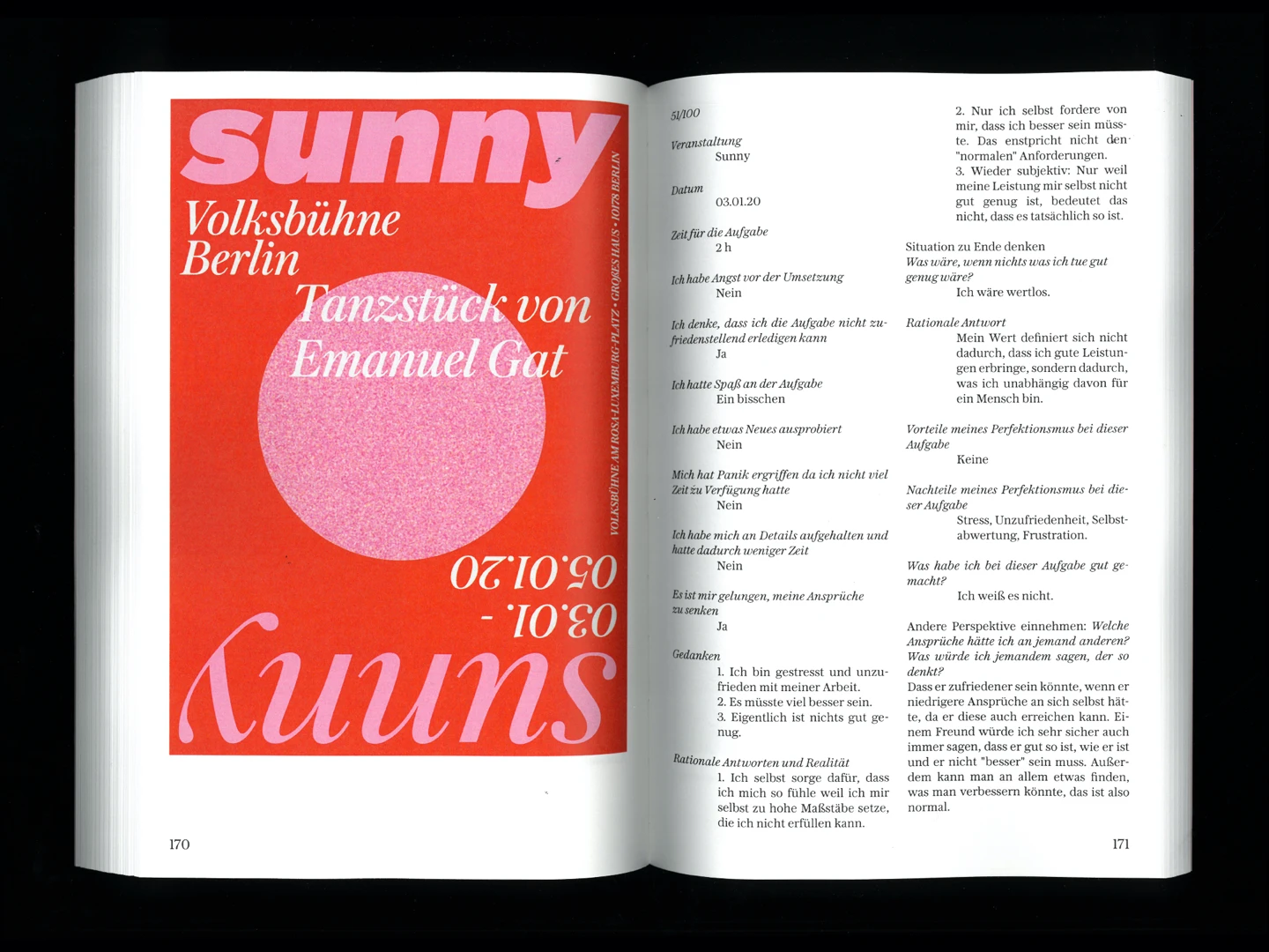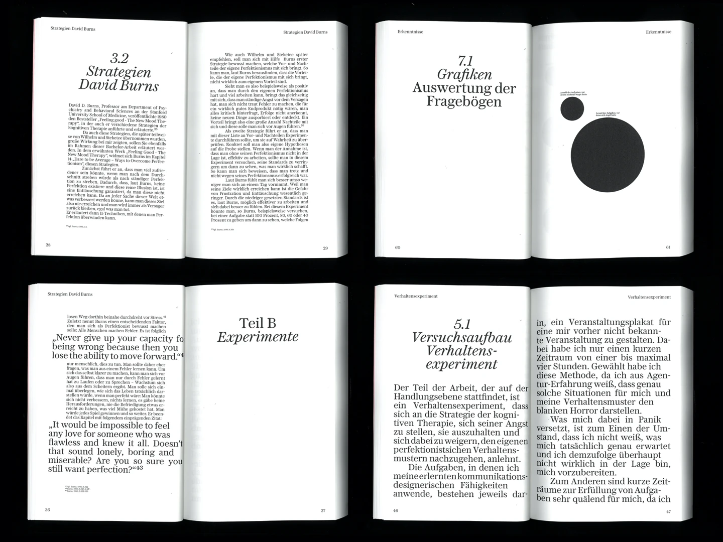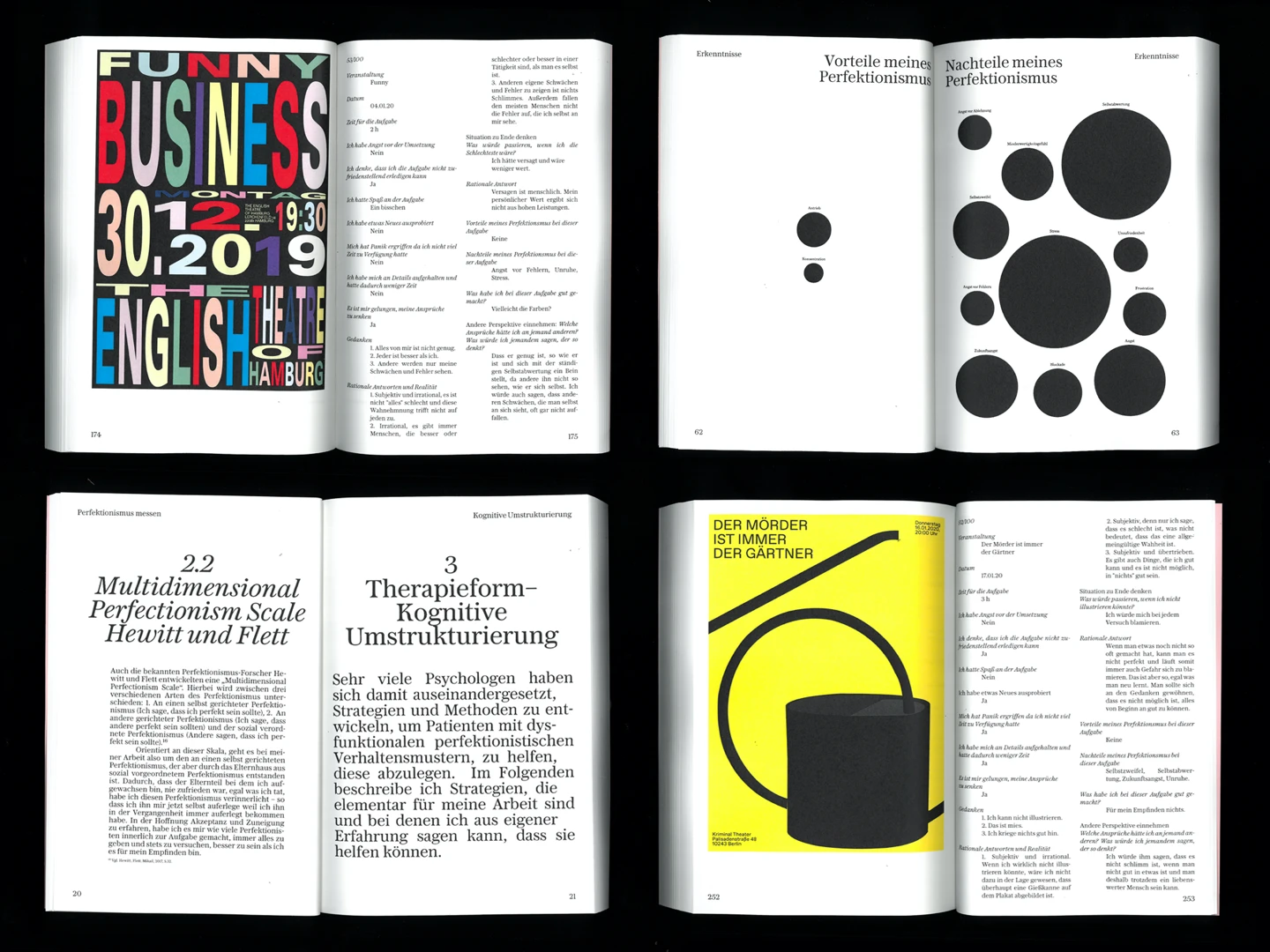 The work consists of an action-related and a thought-related part. Within the thought-related part, she consciously confronted herself with her constant perfectionistic fears. In the action-related part, her self-set task was to design event posters for events that she did not know before, under very strong time pressure. During each task, she recorded her thoughts and then transferred them to her developed questionnaire based on cognitive therapy. Using this, she compared her own assumptions with reality and identified thinking errors in them in order to restructure them.
