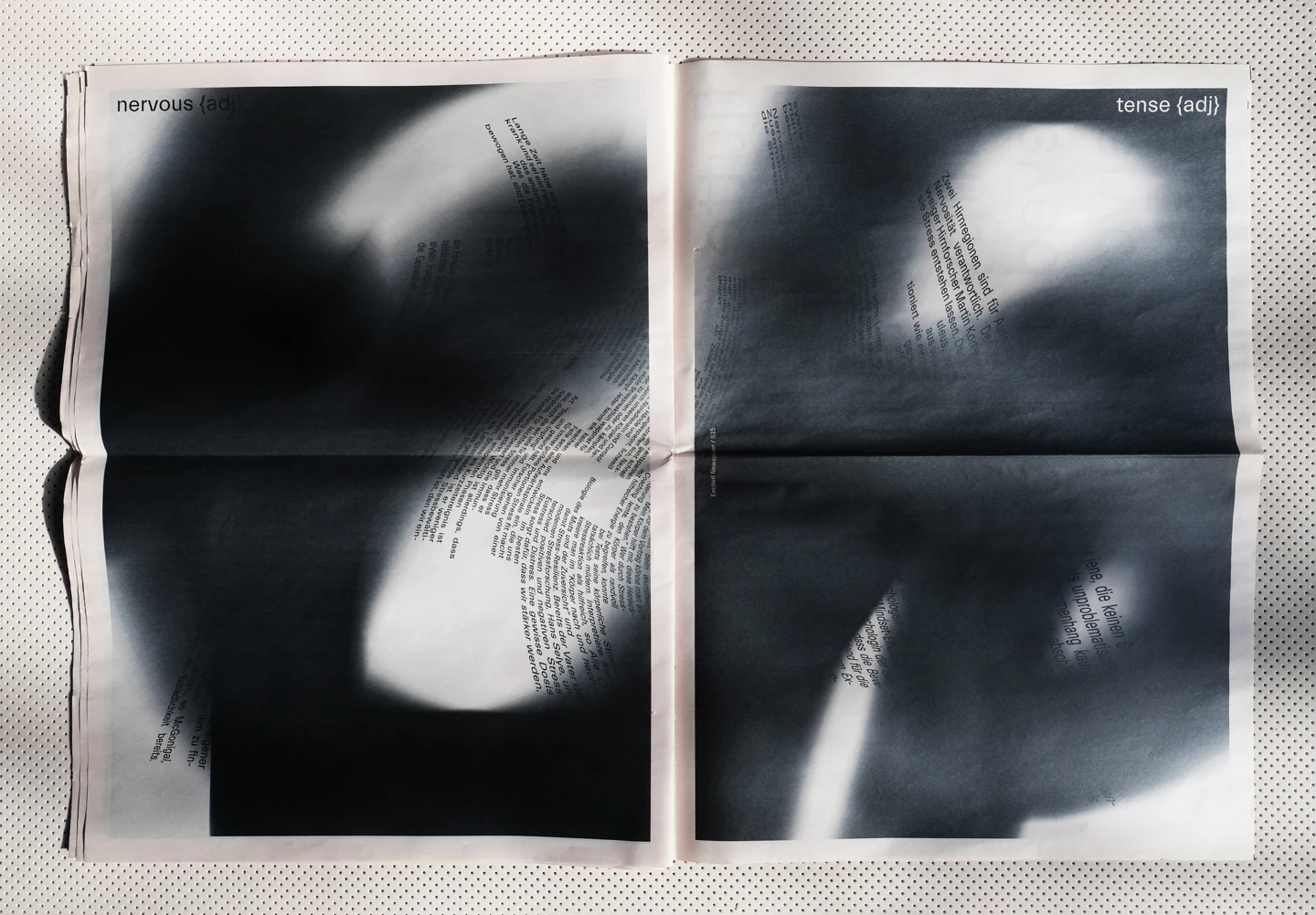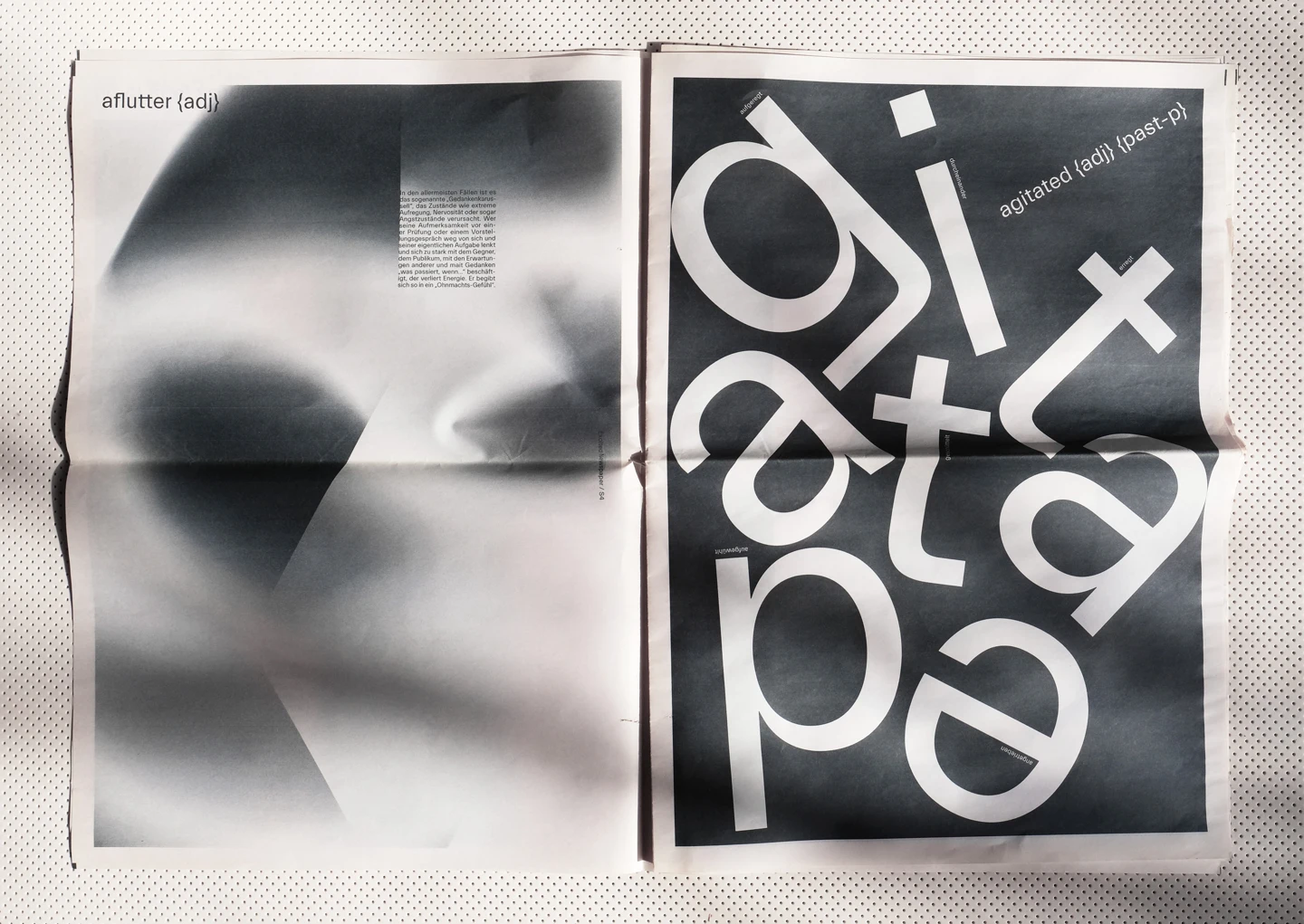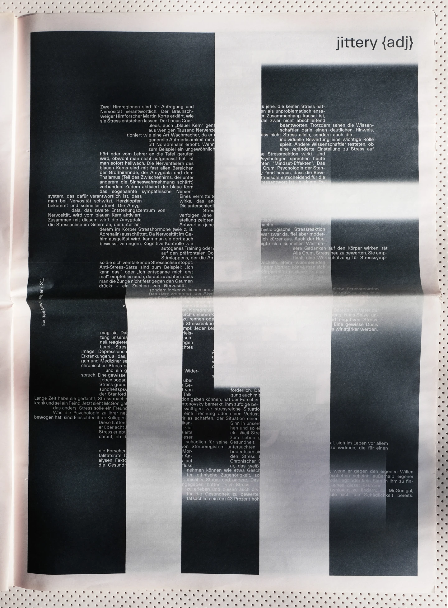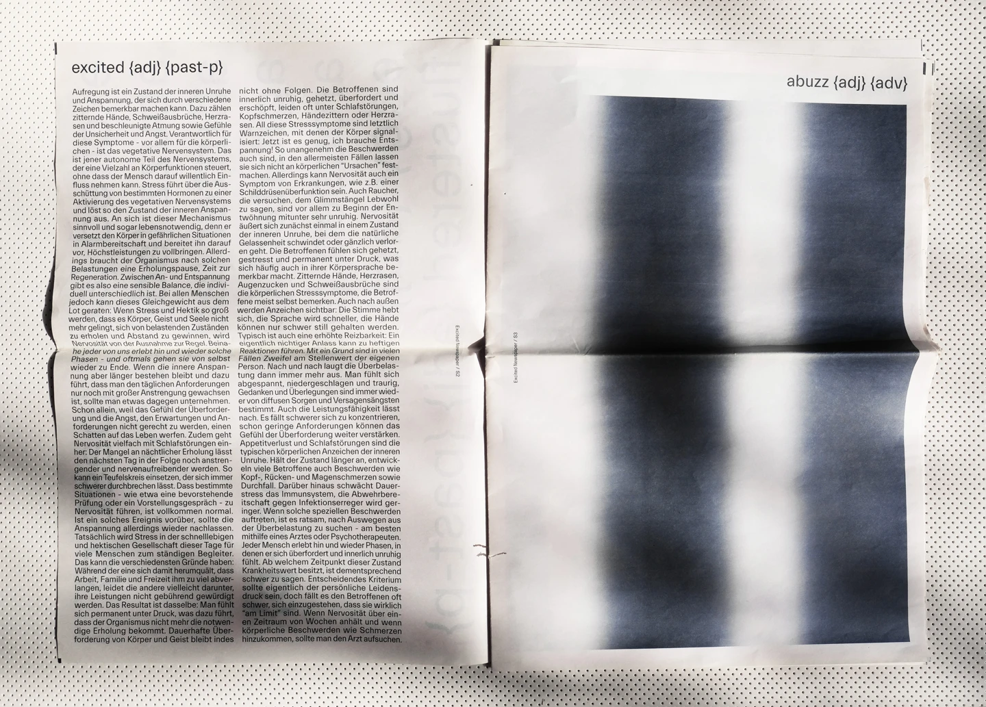Excitement, visually, is something that moves. Therefore, the core element of the design concept was to represent the restlessness that is felt, with an increase until the last double-page spread, as the texts move, rotate and become unreadable until then. In order to accurately reflect the feeling of excitement, individual synonyms associated with it have been illustrated on each page, such as shaky, fluttering, or nervous. To visualize the restlessness that is felt, motion blurs are used as well as text pages where lines of the columns shift more and more.