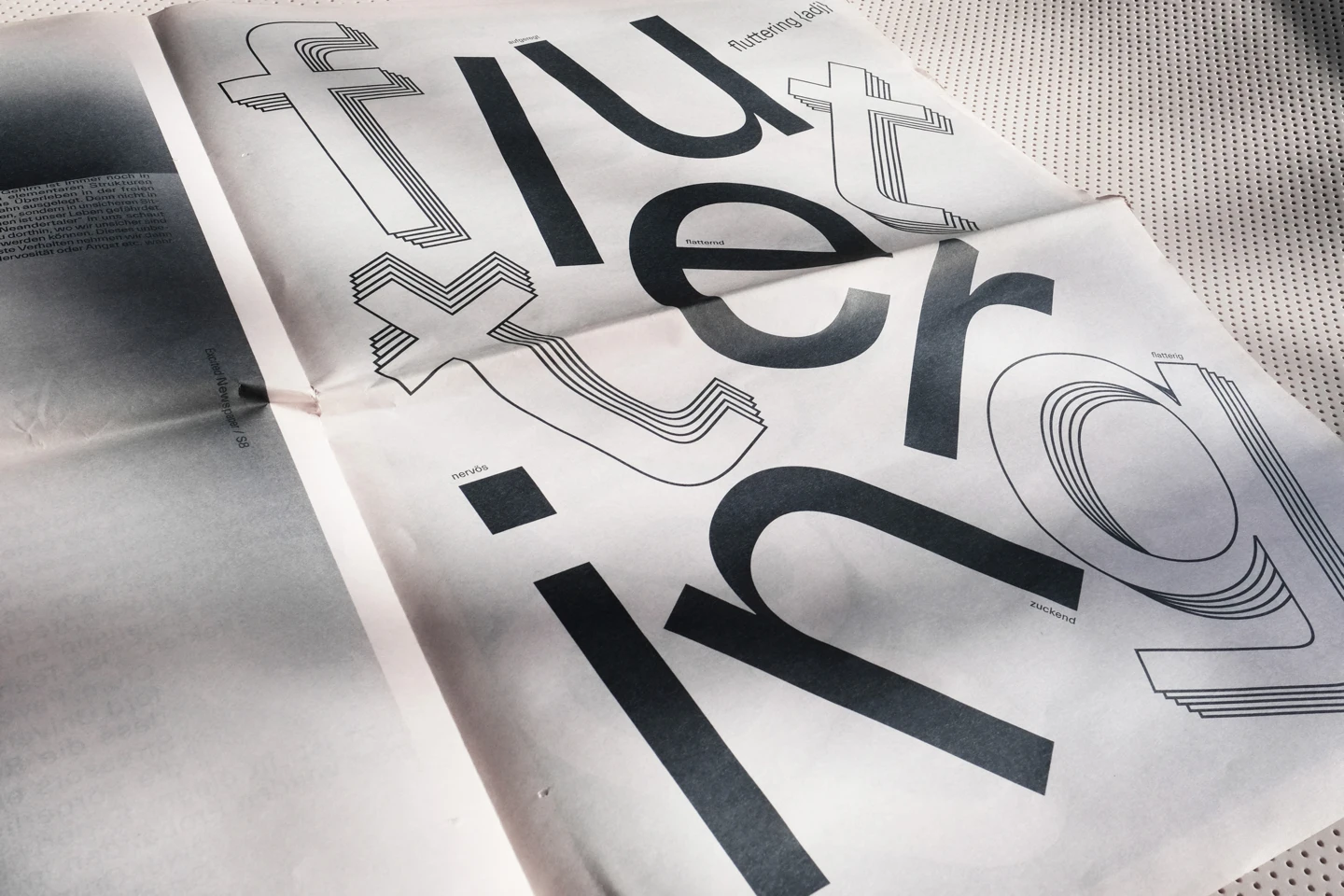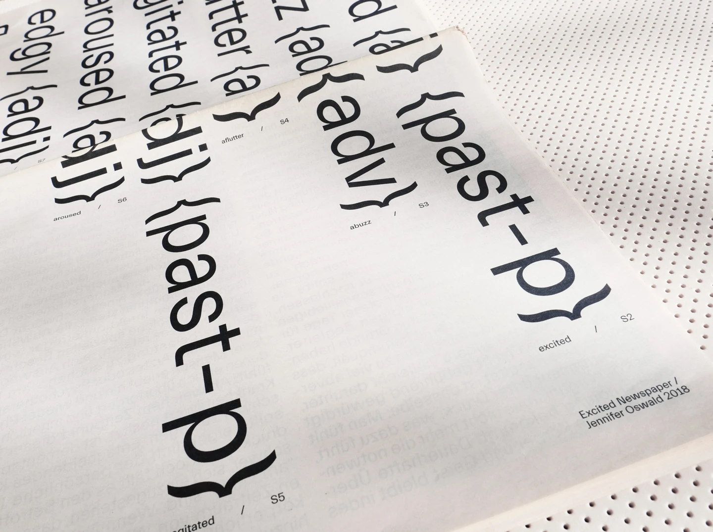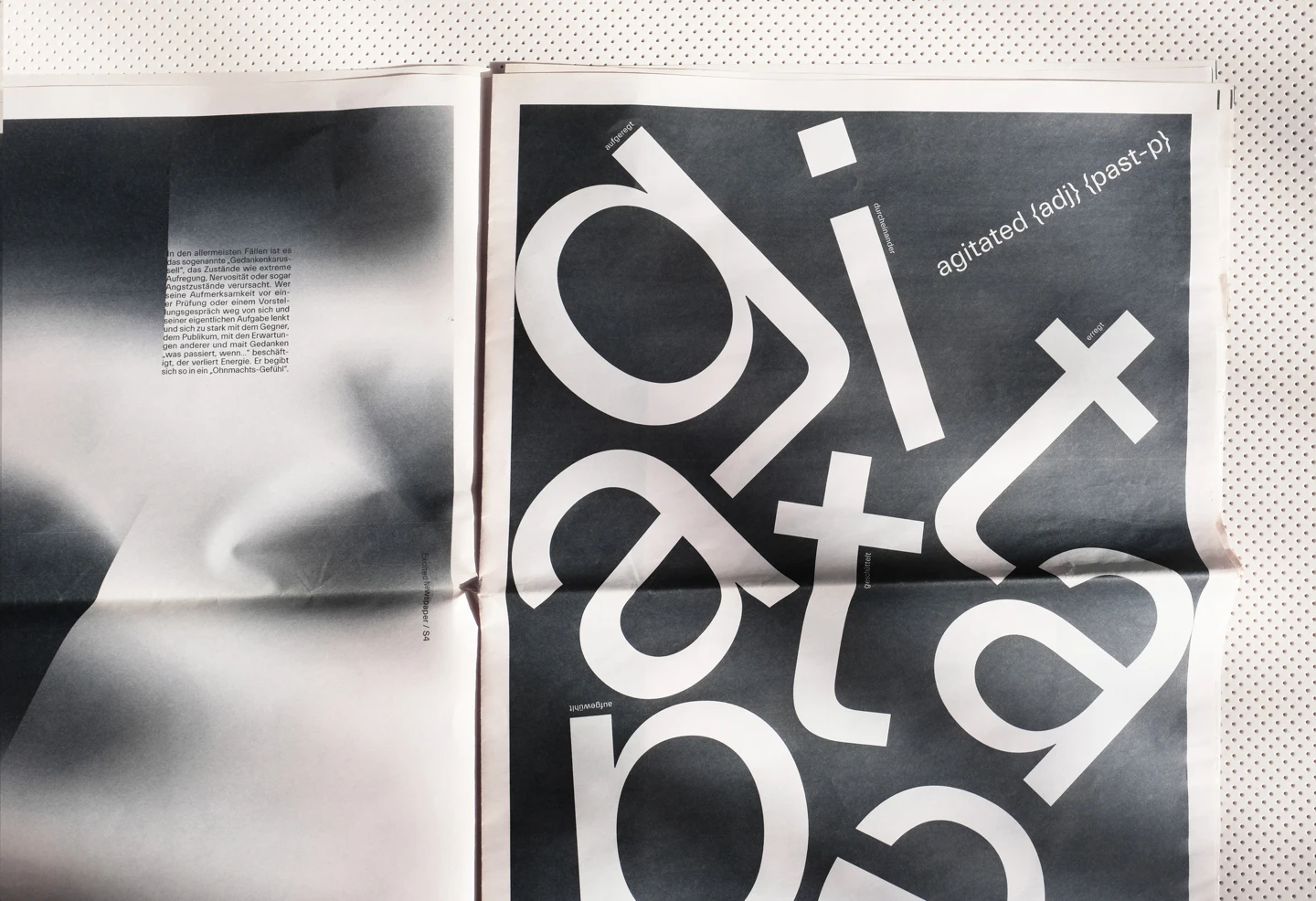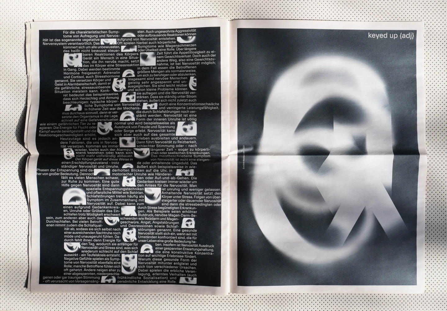 Excitement, visually, is something that moves. Therefore, the core element of the design concept was to represent the restlessness that is felt, with an increase until the last double-page spread, as the texts move, rotate and become unreadable until then. In order to accurately reflect the feeling of excitement, individual synonyms associated with it have been illustrated on each page, such as shaky, fluttering, or nervous. To visualize the restlessness that is felt, motion blurs are used as well as text pages where lines of the columns shift more and more.