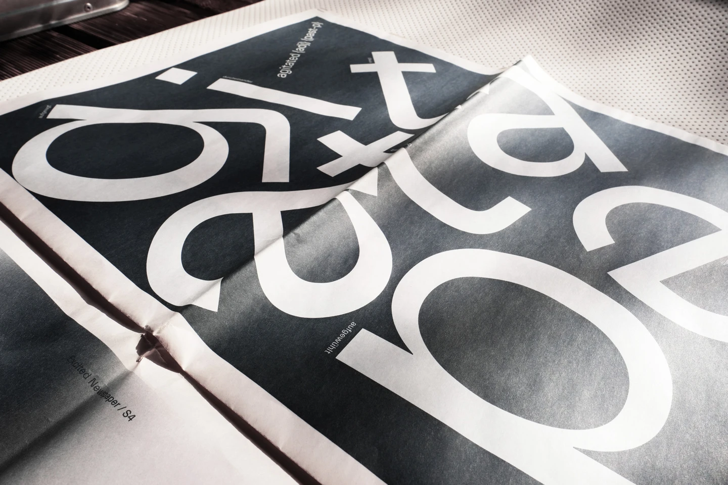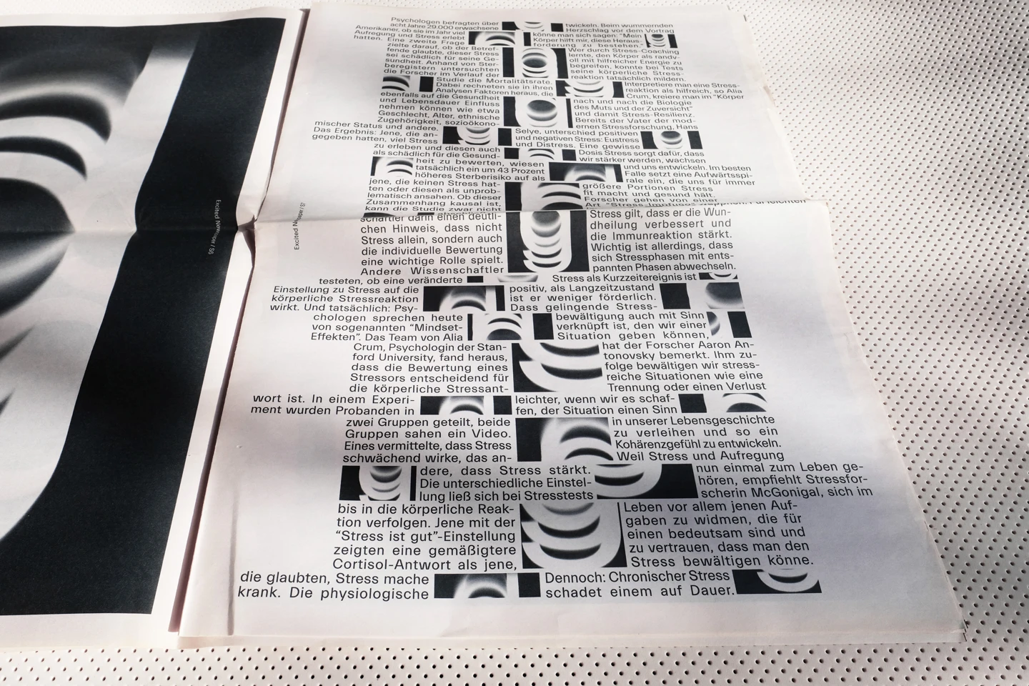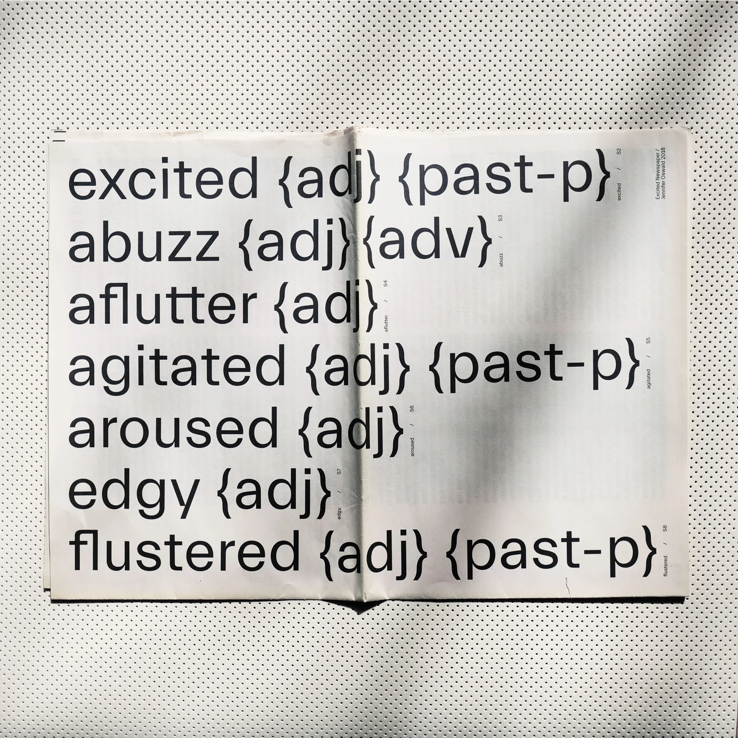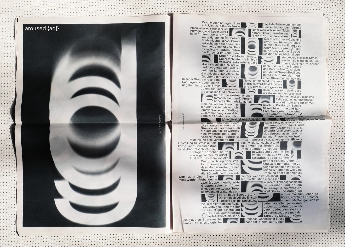 Excitement, visually, is something that moves. Therefore, the core element of the design concept was to represent the restlessness that is felt, with an increase until the last double-page spread, as the texts move, rotate and become unreadable until then. In order to accurately reflect the feeling of excitement, individual synonyms associated with it have been illustrated on each page, such as shaky, fluttering, or nervous. To visualize the restlessness that is felt, motion blurs are used as well as text pages where lines of the columns shift more and more.