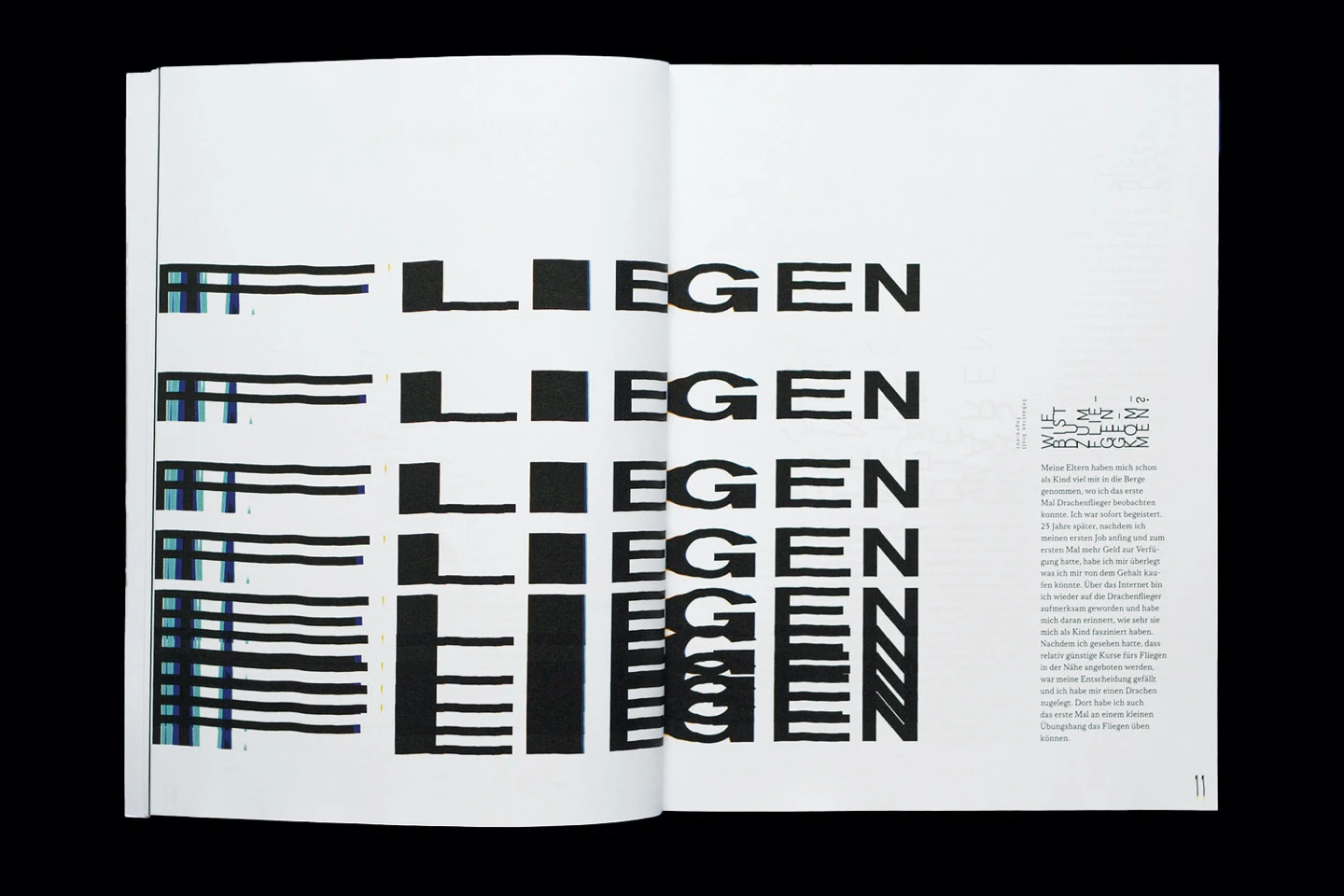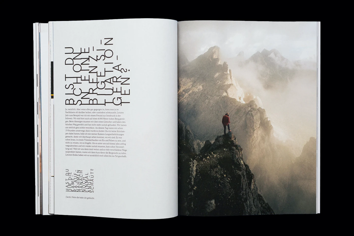 The central design element is the use of scanning techniques that visualize the up and down movement of the theme and that were applied to the headlines and selected text passages. The alignment of the text in the layout is determined by the shape given by the scanned headline. The embossed cover makes the theme also a haptic experience. The texts are for example about the highest mountain someone climbed or personal lows.